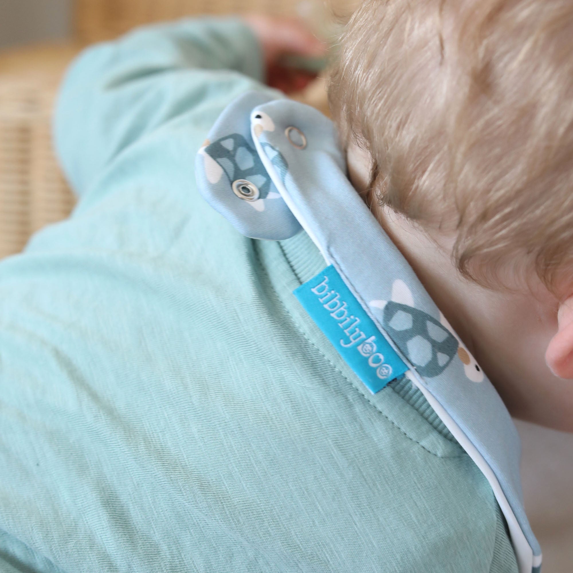 • Child wearing a light blue bib with turtle prints, holding a toy.