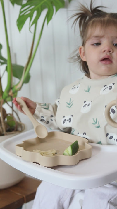 Silicone dinner sets for weaning babies in fun animal shapes! Can be used in the microwave and dishwasher. Made with baby safe food grade silicone.